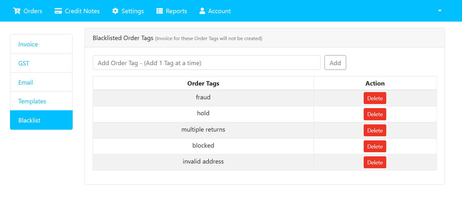 You can provide a list of order tags to be blacklisted. The App will not generate the GST-compliant invoices containing those tags and the same will not be visible in the report sections when viewing or downloading.