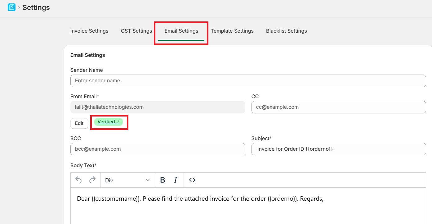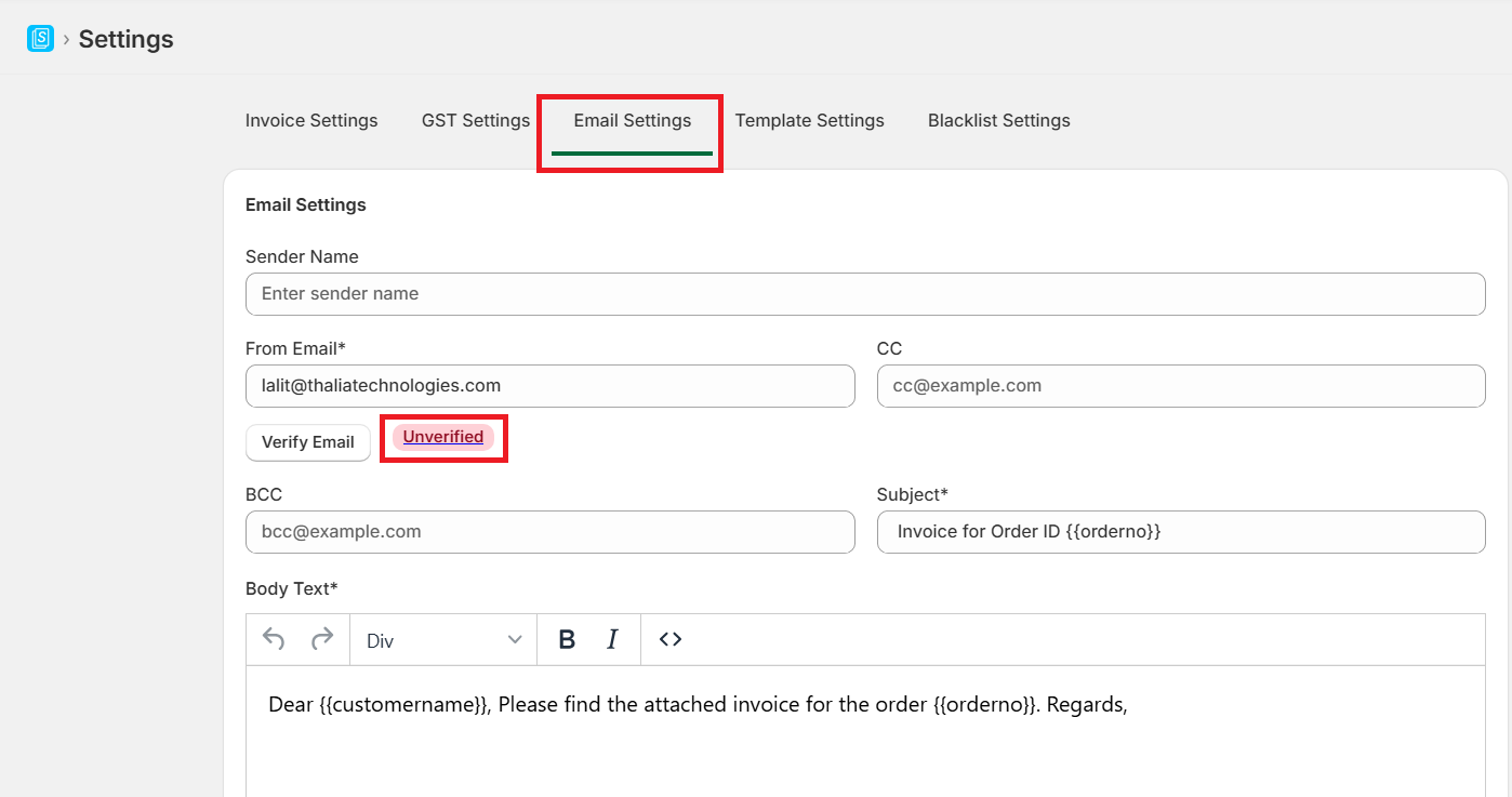 Verifying your email address will help ensure that invoice emails are delivered properly and avoid being marked as spam.
