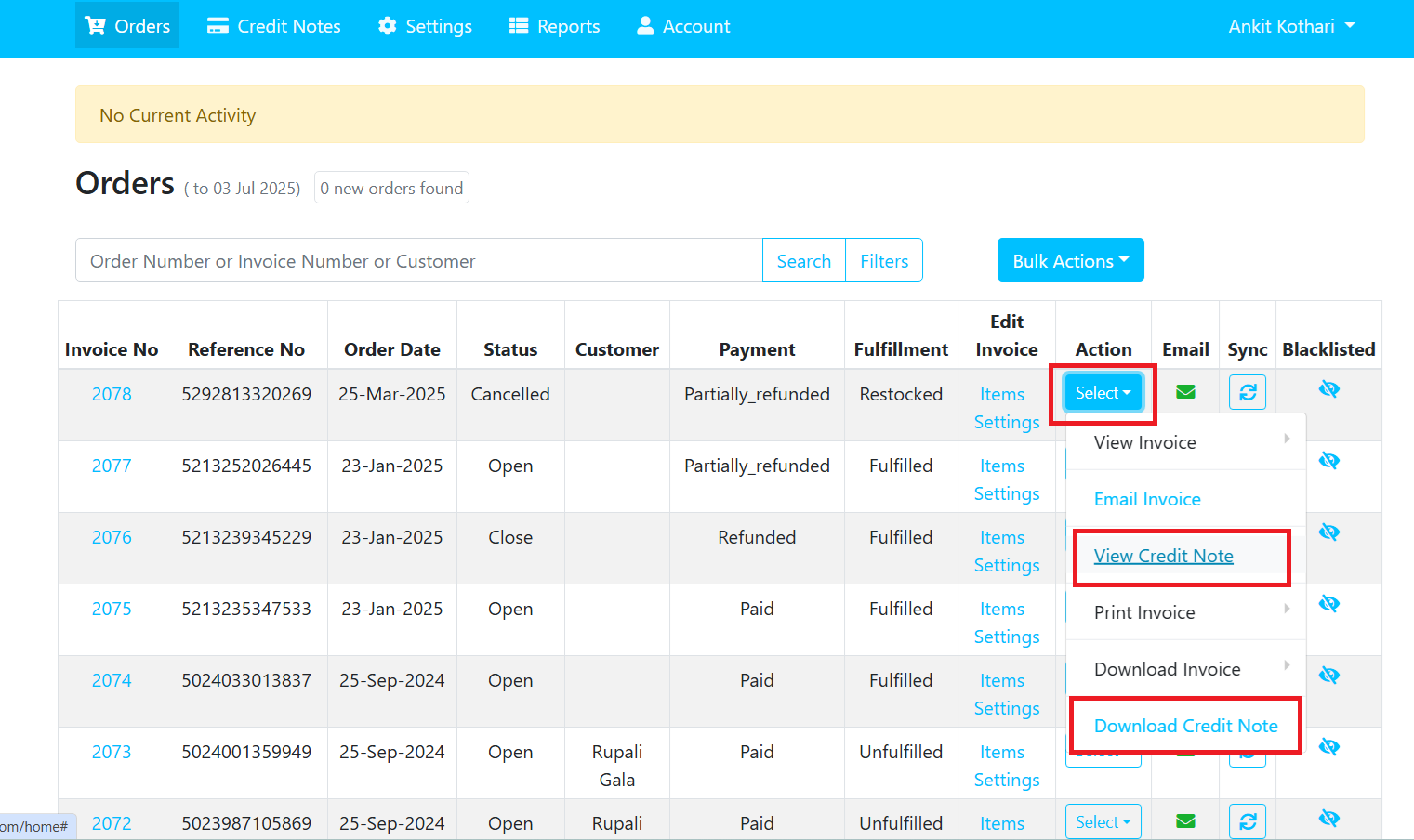 - Only in case where the item/order is canceled, removed, refunded, partially refunded, voided is eligible for credit note.